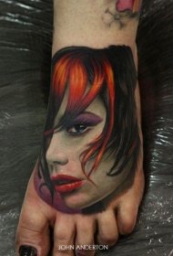 女性脚背惊人逼真的女人肖像纹身图案