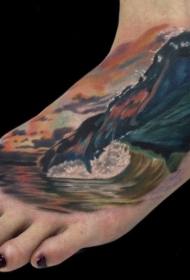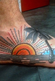 脚背彩色简单自制海洋日落与棕榈树纹身