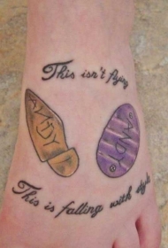 女性脚背上的彩色小徽章与字母纹身图案