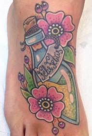 脚背彩色魔术瓶与花朵纹身图案