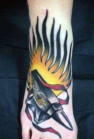 脚背彩绘铁砧与火纹身图案