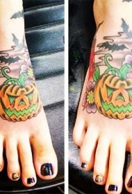 脚背幻想南瓜与鲜花和蝙蝠纹身图案