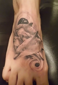 脚背可爱的手绘黑灰海豚纹身图案