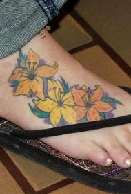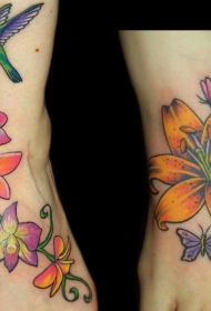 脚背五颜六色的百合花与蜂鸟纹身图案