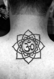 颈部点刺风格黑色梵花和印度教字符纹身图案