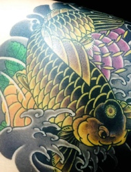 遮盖着半边肩膀的金色大鲤鱼纹身
