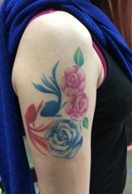 女生手臂上彩绘渐变简单线条植物花朵和金鱼纹身图片
