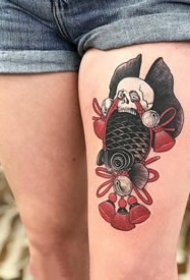 水墨金鱼纹身 女生大腿上黑色的金鱼纹身图片