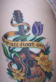 腰部彩色漂浮的鲜花和吉他纹身图片
