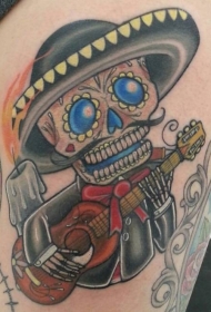 腿部彩色墨西哥糖骷髅弹吉他纹身图片