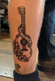 吉普森吉他纹身 男生小腿上花朵和吉他纹身图片
