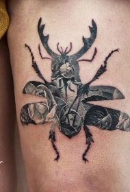 大腿黑色的甲虫轮廓与玫瑰纹身图案