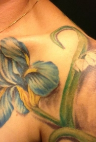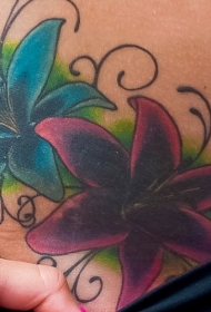 蓝色和紫罗兰色热带花卉腹部纹身图案