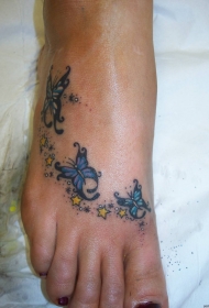 三只蓝色彩绘蝴蝶脚背纹身图案