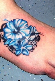 脚背部落图腾与蓝色夏威夷木槿花纹身图案