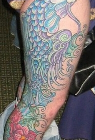 腹部蓝色鲤鱼和红色花朵纹身图案