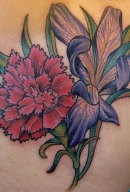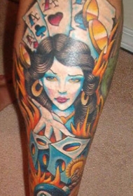 小腿彩绘扑克牌女人脸和火焰纹身图案