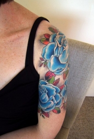 大臂亚洲风格红色和蓝色牡丹花小鸟纹身图案