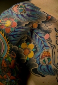 背部亚洲卡通神秘的女人与鹰和蓝眼睛纹身图案
