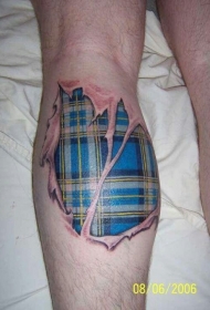 小腿写实蓝色苏格兰花纹撕皮纹身图案