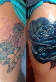 大腿非常逼真的蓝色玫瑰纹身图案