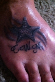 脚背蓝色海星和波浪与字母纹身图案