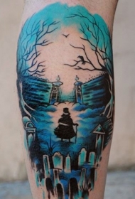 卡通七彩神秘女巫师和蓝色兔子纹身图案