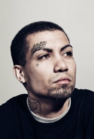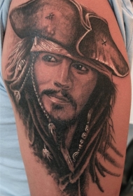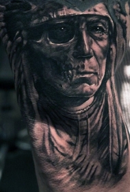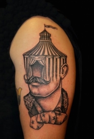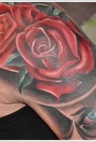 大臂简单的彩色玫瑰与神秘的脸纹身图案