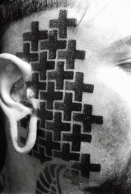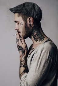 男子脸部数字和颈部骷髅猫头鹰old school纹身图案