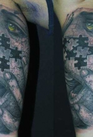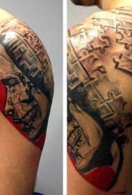 肩部彩色拼图风男子肖像纹身图案