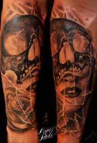 手臂恐怖风格骷髅与女人肖像纹身图案