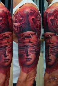 男子大臂红墨水式女人脸玫瑰纹身图案