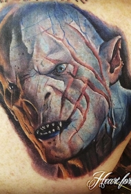 背部彩色的兽人面纹身图案