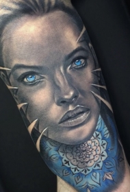 大臂彩绘女子肖像与花朵纹身图案