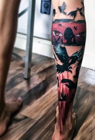 小腿彩色人眼与乌鸦彩色纹身图案