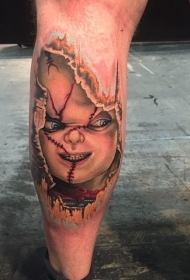 小腿恐怖风格彩色可怕的娃娃脸纹身图案