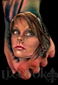 手背现实主义风格彩色女人脸纹身图案