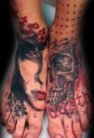 脚背色彩与女人肖像骷髅纹身图案