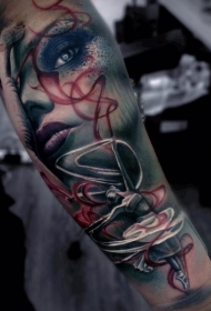 小臂彩色吐血女人脸纹身图案