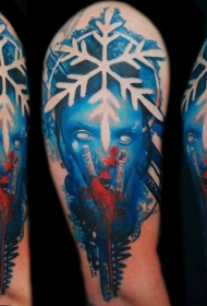 大臂梦幻风格的彩色神秘女人脸与雪花纹身图案