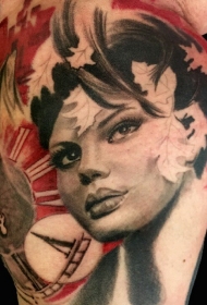 彩色漂亮女生肖像时钟和叶子纹身图案