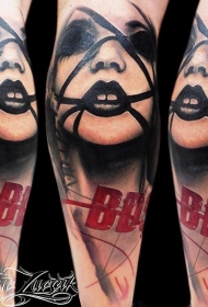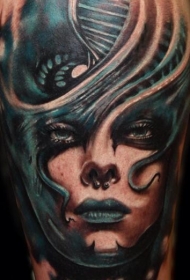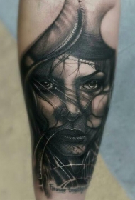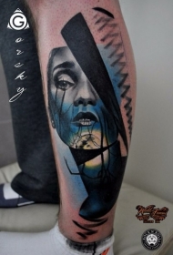 小腿现实主义风格彩色神秘女人脸纹身图案