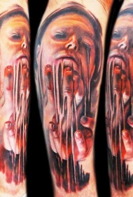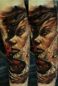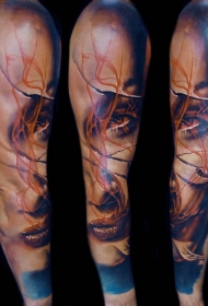 逼真写实风格彩色带疤女人脸手臂纹身图案