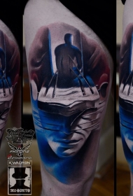 大腿彩色女性肖像与恶魔手纹身图案