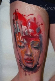 大腿插画风格彩色女生肖像纹身图案