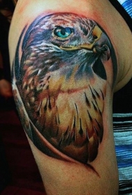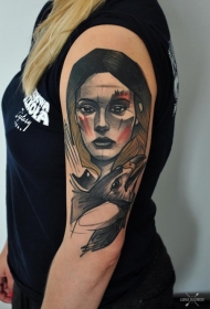 大臂彩色女人脸与猫头鹰眼睛纹身图案