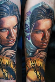 小臂彩色令人毛骨悚然的脸与十字架纹身图案