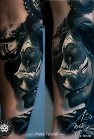 黑灰风格恶魔骷髅和女人手臂纹身图案