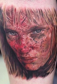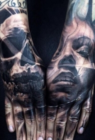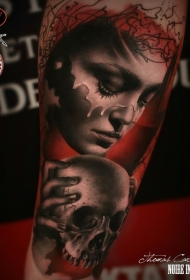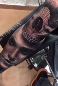 逼真的彩色女人肖像与骷髅手臂纹身图案