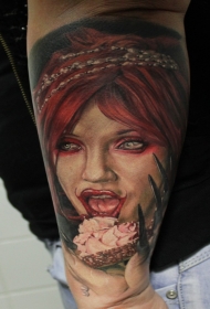 恐怖风格的彩色女人和蛋糕手臂纹身图案